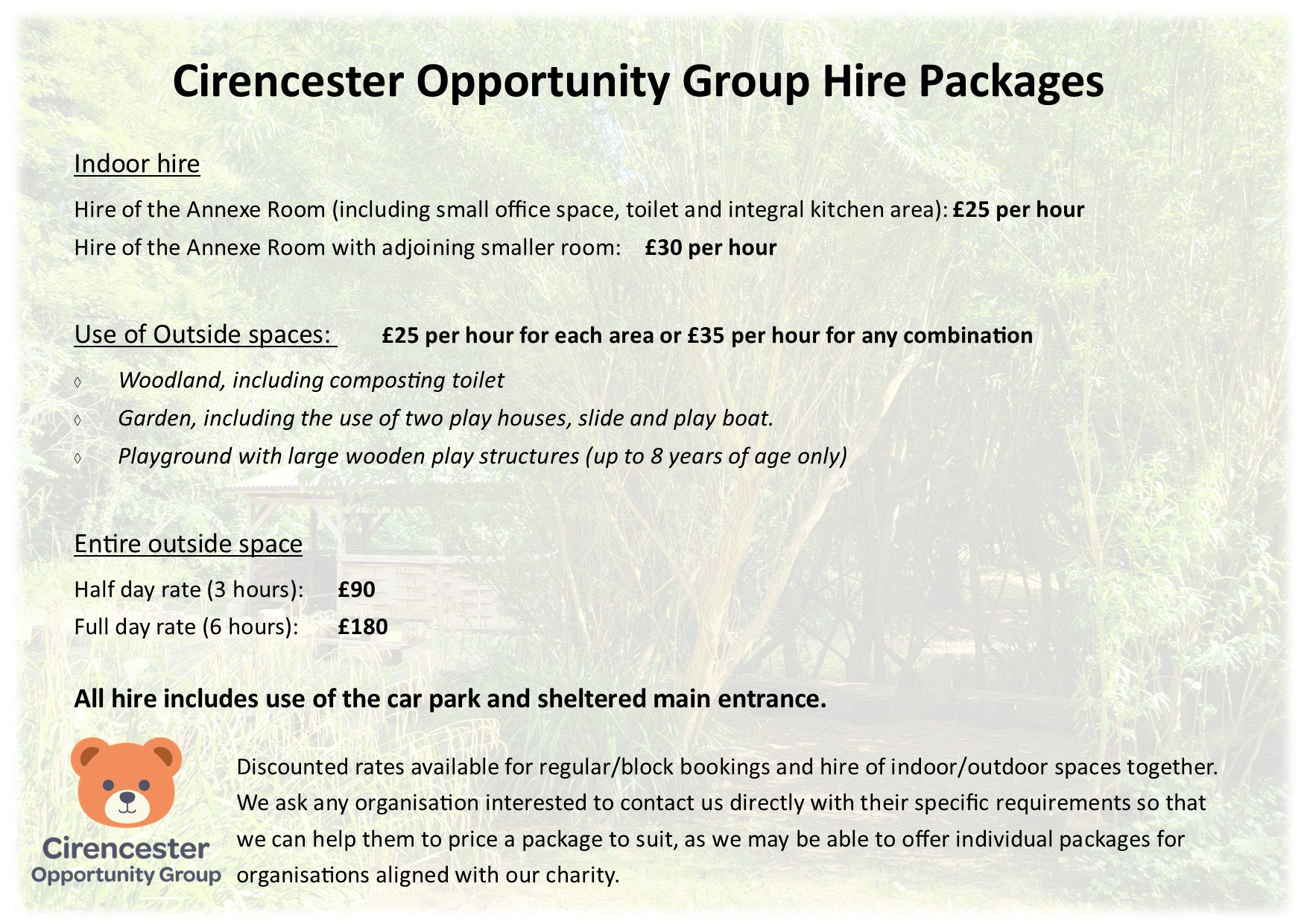 Here at COG we benefit from a purpose-built early years centre with a variety of spaces and large, beautiful grounds. We are fortunate to have our own car park which is available for use when hiring our indoor and outdoor spaces.